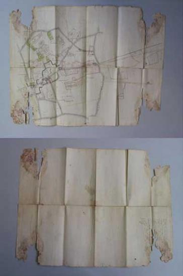 Plié pour stockage: usure et perte de matière à l’angle des plis Une mouillure sur le plis supérieur a provoqué des moisissures, en report aux quatre angles, causant des lacunes et des zones de papier fortement défibrées.